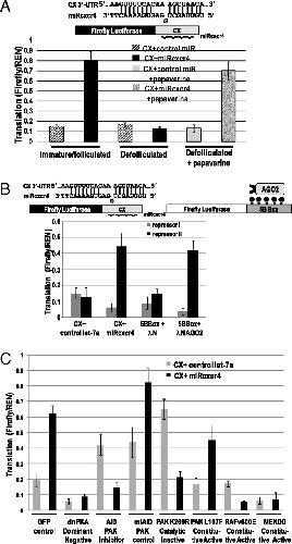 Fig. 2. The cAMP/PKA pathway mediates up-regulated translation by microRNPs in oocytes. (A) Addition of 1.25 mM papaverine, a phosphodiesterase inhibitor that blocks turnover of cAMP, restores up-regulated translation of the CX reporter by miRcxcr4 (but not by control miR, let-7a) in defolliculated oocytes. (B) Expression of PKA repressor I (RI) abrogates, whereas repressor II (RII) activates, translation of the CX reporter in the presence of miRcxcr4 and of the AGO2-tethered reporter in oocytes. (C) Blocking the PKA pathway (dominant negative PKA, dnPKA) or the downstream PAK pathway (using a dominant negative inhibitor, AID) causes loss of up-regulation of CX by miRcxcr4 in folliculated immature oocytes compared with a mutant form of the inhibitor, mtAID, or a GFP control. Expression of a constitutively active PAK, L107F, enables up-regulated expression of CX by miRcxcr4 in defolliculated oocytes whereas a kinase inactive form, K299R, does not. Expression of a constitutively active RAFv600E or a constitutively active MEK, MEKDD (both are turned off by PAK), blocks up-regulated expression of CX by miRcxcr4 compared with the GFP control in folliculated immature oocytes. L107F and K299R samples used defolliculated oocytes, whereas all other samples were folliculated oocytes. All reporters were in vitro-transcribed, capped luciferase RNAs; the signaling proteins were expressed from plasmids. Firefly luciferase values were normalized against REN.
