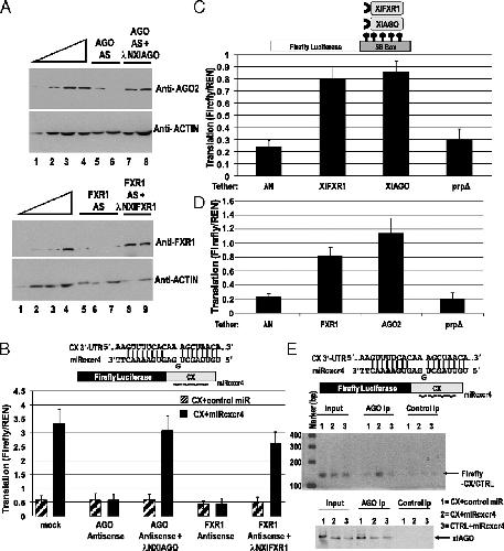 Fig. 3. FXR1 and xlAGO are required for microRNA-mediated up-regulated translation in oocytes. (A) Sixteen hours of DNA antisense treatment decreases endogenous FXR1 and AGO protein levels in the oocyte, which were rescued by expression of in vitro-transcribed mRNAs encoding λN-tagged Xenopus FXR1 and AGO, respectively, as observed by Western blotting (SI Methods and Fig. S3D). Actin served as a loading control. Twofold dilutions (12.5â100%) of mock-treated immature oocyte extract (lanes 1â4) are shown: Upper (AGO) and Lower (FXR1). Lanes 5â6 and 7â8 (Upper) are duplicate samples, as are lanes 5â7 and 8â9 (Lower). (B) MiRcxcr4 activates translation of the CX reporter mRNA expressed from a plasmid when coinjected into the nuclei of immature, folliculated oocytes (mock). Antisense reduction of Xenopus AGO or FXR1 levels abrogates activation of the CX reporter, which can be rescued by expression of the λN-tagged resistant clones. (C) Expression of λN-tagged Xenopus FXR1 or AGO (XlFXR1 and XlAGO) mRNAs into immature oocyte nuclei causes translation activation of the co-injected tethered reporter. λN and the λNprpδ mutant form of human AGO2 are controls. (D) Plasmids expressing λN-tagged human FXR1 or AGO2 co-injected into immature oocyte nuclei cause translation activation of the tethered reporter. In vitro-transcribed, capped XlFXR1 and XlAGO mRNAs (AâC), and plasmids expressing hAGO2 and hFXR1 (D) were used for protein expression; experiments in C and D used in vitro-transcribed capped tethered reporter. In BâD, Firefly luciferase values were normalized against REN. (E) RT-PCR analysis (Upper) of RNAs extracted from anti-AGO2 or control anti-FLAG co-immunoprecipitates (Ip) from oocyte nuclear extracts co-injected with the CX or CTRL reporters and the specific miRcxcr4 or the control microRNA, let-7a, reveals significant association of CX but not CTRL mRNA with xlAGO in the presence but not absence of miRcxcr4. (Lower) Western blot of AGO protein in input and immunoprecipitation (Ip) lanes.