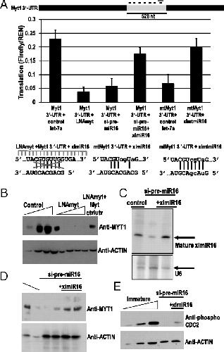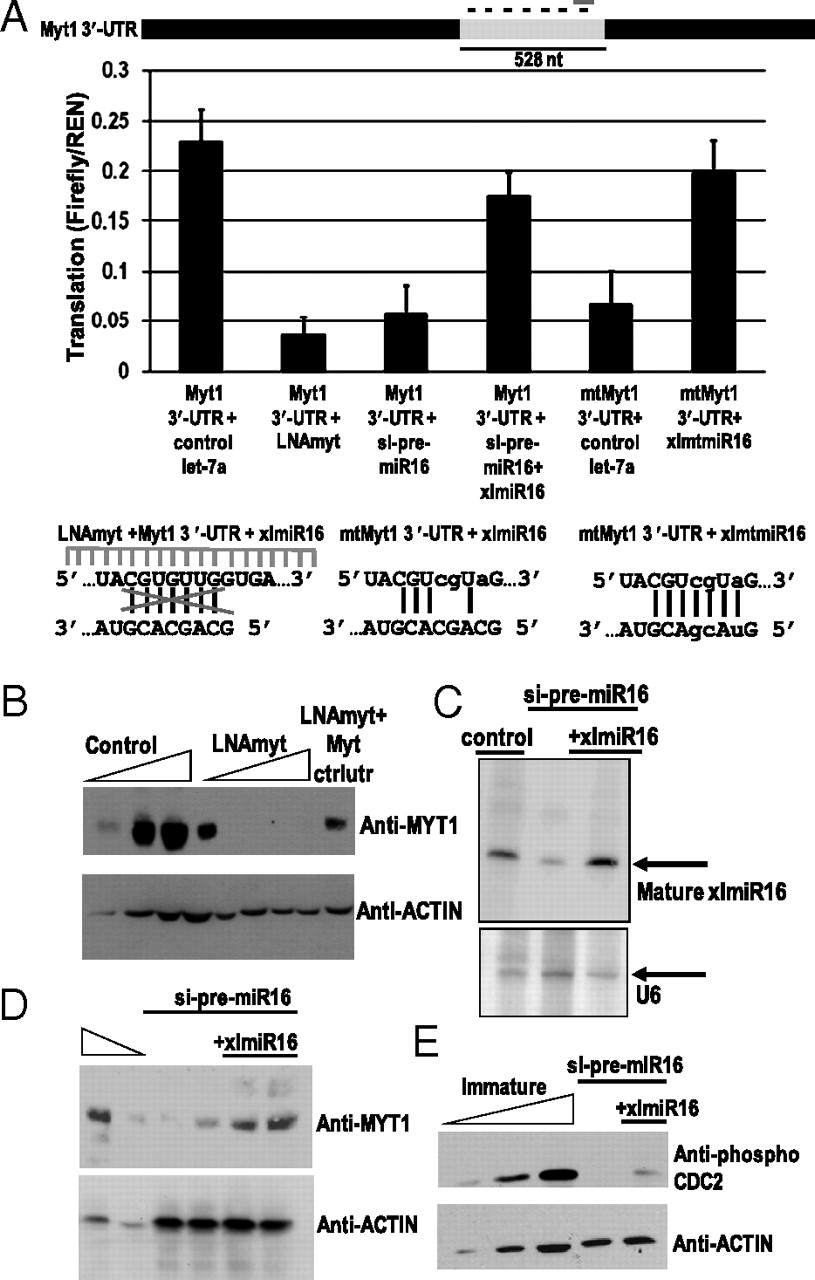Fig. 5. Translation activation of Myt1 mRNA by xlmiR16 is essential for maintenance of the immature state. (A) Coinjection of an LNA antisense oligonucleotide complementary to the xlmiR16 target site (LNAmyt, gray dash) in the 528-nt Myt1 3â²-UTR abrogates translation activation, as does knockdown of xlmiR16 with si-pre-miR16, which can be rescued by B1/xlmiR16. Mutation of this target site (mtMYT1) abrogates translation activation, but add-back of the compensatorily mutated microRNA, xlmtmiR16, restores activation. Firefly luciferase values were normalized to REN. Mutations are in lowercase. (B) LNAmyt (increasing twofold, 0.25â4 pmol) blocks accumulation of endogenous Myt1 protein in the oocyte, whereas Myt1 protein levels are restored at the highest LNAmyt concentration by coinjecting a Myt1 expression vector lacking its 3â²-UTR (Mytctrlutr), compared with twofold dilutions (25â100%) of control untreated immature oocyte extract. (C) Northern blot demonstrating that depletion of mature xlmiR16 in the oocyte can be reversed by injecting synthetic mature B3/xlmiR16. U6 controlled for loading. (D) Pretreatment with si-pre-miR16, which lowers endogenous Myt1 protein levels in the oocyte (duplicate lanes), can be reversed by injection of synthetic mature B3/xlmiR16 (duplicate lanes) compared with untreated immature oocyte extract (100% and 50%). (E) Pretreatment with si-pre-miR16 leads to decreased levels of Myt1 protein and consequent loss of phosphorylated CDC2, which can be restored by addition of synthetic mature B3/xlmiR16, as judged by comparison with twofold dilutions (25â100%) of untreated immature oocyte extract. Actin served as the loading control for Western analyses (B, D, and E).