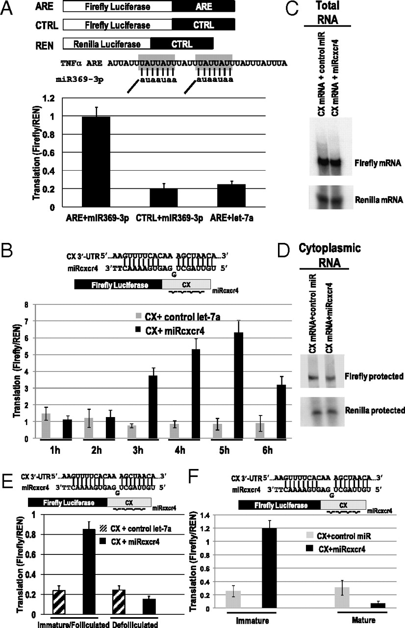 Fig. 1. MicroRNAs mediate up-regulated expression of reporters coinjected into the GV of folliculated stage IVâVI oocytes. (A) MiR369-3p (but not control let-7a) up-regulates expression of the ARE reporter (but not of CTRL reporter), when coinjected into the GV with the ARE and CTRL luciferase plasmids along with REN. (B) MiRcxcr4 (but not control let-7a) up-regulates expression of the CX reporter (2, 11) over time when coinjected with the CX luciferase plasmid into GV. MiRcxcr4 and the control miR (let-7a) do not alter total oocyte (C) or cytoplasmic levels (D) of the CX reporter mRNA. Northern blots show the protected 250-nt band for the Firefly luciferase reporter and a 100-nt protected band for the coinjected REN reporter (SI Methods). (E) MiRcxcr4 (but not control let-7a) up-regulates expression of the CX transcript when coinjected into GVs of folliculated but not of defolliculated oocytes. (F) MiRcxcr4 represses translation of the CX reporter in progesterone-matured oocytes as opposed to up-regulated expression in immature, folliculated oocytes. MiR:mRNA base pairing shown in A and B and in E and F, as well as in subsequent figures. CâF used in vitro-transcribed, capped luciferase reporter RNAs. Firefly luciferase values were normalized to the cotransfected REN control.