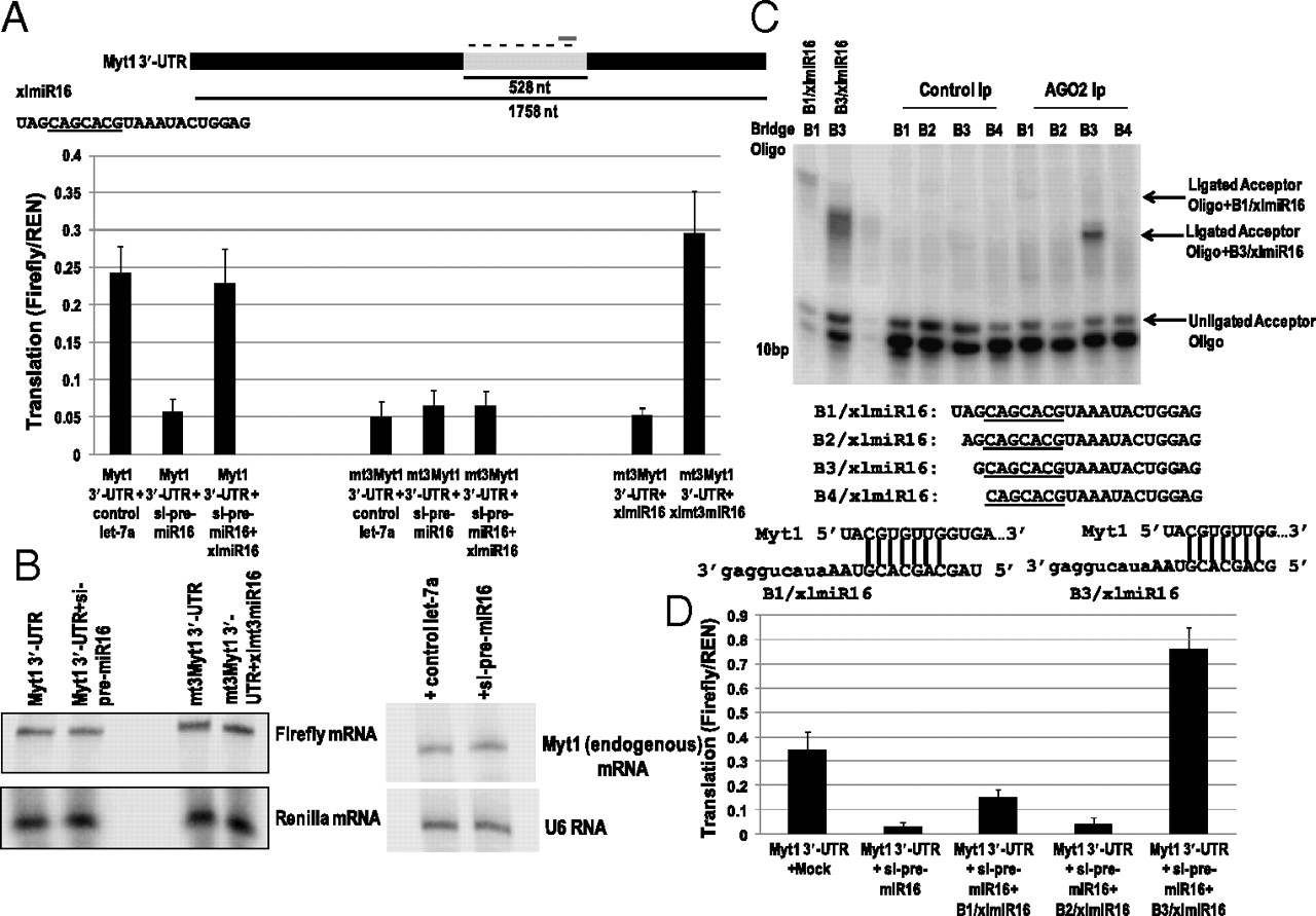 Fig. 4. Myt1 mRNA translation is up-regulated by a 5â² variant xlmiR16. (A) Myt1 3â²-UTR has seven putative xlmiR16 sites (dashes). Mutation of the site at 1,284 nt (mt3Myt1 3â²-UTR) in the 528-nt or full-length Myt1 3â²-UTR failed to demonstrate translation activation and was unaffected by xlmiR16 presence or depletion (SI Methods; siRNAs antisense to pre-miR16 reduced mature xlmiR16 after 6 h, likely because of interference with processing or stability instead of cleavage activity; Fig. S4A). Translation activation is restored by addition of a compensatorily mutated xlmt3miR16 that can base pair to the mutated site (SI Methods). Both B1/xlmiR16 (shown) and B3/xlmiR16 (Fig. 4C shows base pairing) are able to rescue. (B) Northern analyses of Firefly reporters containing the 528-nt Myt1 3â²-UTR and mt3Myt1 3â²-UTR and REN RNA levels after treatment with si-pre-miR16 with or without mt3xlmiR16 add-back. (Right) Endogenous Myt1 mRNA levels with or without si-pre-miR16 treatment; U6 RNA is a loading control. (C) Splint ligation reactions (SI Methods) containing the labeled 14-nt acceptor oligo and RNAs isolated from anti-AGO2 or -FLAG (control) immunoprecipitates (Ip). XlmiR16 variants that are successively truncated by one nucleotide at the 5â² end (B1/xlmiR16-B4/xlmiR16) were detected using DNA bridge oligos B1-B4, complementary to the first 16 nt of the predicted microRNAs. The predicted full-length form, B1/xlmiR16, is only faintly visible in the sample immunoprecipitated with anti-AGO2, suggesting that it is less abundant than B3/xlmiR16, which is revealed by the B3 bridge oligo to be an abundant microRNA in anti-AGO2 immunoprecipitates. Lanes marked B1/xlmiR16 and B3/xlmiR16 show synthetic miR16 RNAs as size controls. Underlined nucleotides are required for interaction with the Myt1 3â²-UTR. Base pairing between Myt1 target site and B1/xlmiR16 or B3/xlmiR16 are shown. (D) Oocytes treated with mock (let-7a) or si-pre-miR16 were coinjected with synthetic xlmiR16 forms to assess rescue of full-length Myt1 3â²-UTR reporter translation. Firefly luciferase values were normalized to REN. B1/xlmiR16 undergoes trimming to the B3/xlmiR16 form and rescues translation to a lesser extent than B3/xlmiR16.