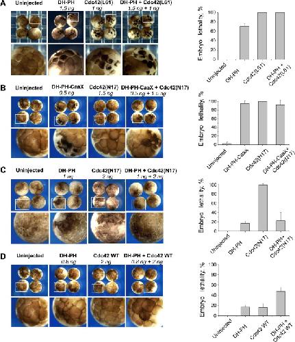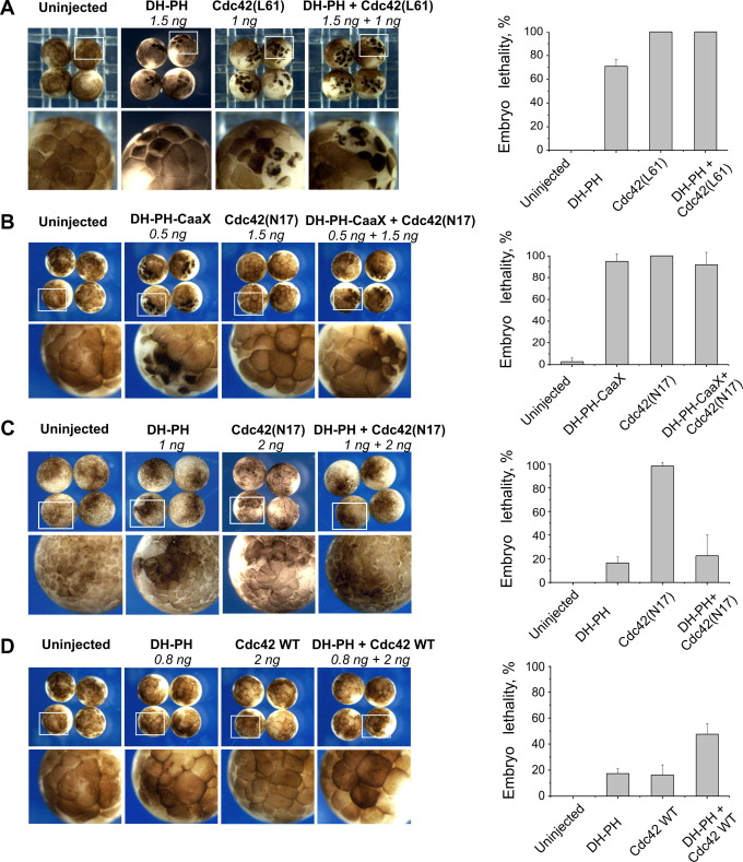 Phenotypes induced by coexpression of the DH–PH tandem and wild type or mutant Cdc42 forms. Two-cell stage embryos were coinjected with the indicated amounts of mRNAs encoding (A) the DH–PH tandem and constitutively active Cdc42(L61), (B) the DH–PH–CaaX domains and dominant negative Cdc42(N17), (C) the DH–PH tandem and dominant negative Cdc42(N17), (D) the DH–PH tandem and wild type Cdc42. The embryos were raised to the developmental stage 6.5–7 and the phenotypes were analyzed. The upper panel of each image presents the animal hemisphere of the embryos. The lower panel shows a higher magnification of the area enclosed by a rectangle in the upper panel. At the developmental stage 24–25 the lethality of embryos was quantified. The data are represented as mean ± SD from at least two independent experiments.