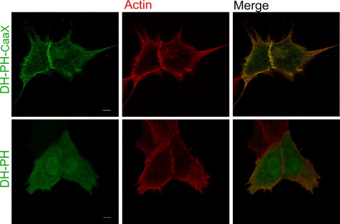 Overexpression of the DHâPH tandem affects the actin cytoskeleton of Xenopus embryos. (A) mRNA encoding DHâPHâC2âCaaX (1 ng) was microinjected into one blastomere of two-cell stage embryos. Animal caps were dissected at stage 10.25, fixed and stained with an anti-Myc antibody followed by Alexa 546-conjugated secondary antibodies. The actin cytoskeleton was detected using Alexa Fluor 488 phalloidin, and nuclei were stained with DAPI. (B) 0.3 ng actin-GFP mRNA alone or together with 1 ng DHâPHâMyc mRNA was microinjected into two-cell stage embryos. Embryos were raised to the developmental stage 10.25, animal caps were then dissected and fixed. The immunofluorescence images represent a single optical section of embryonic cells expressing actin-GFP alone (left) or together with DHâPHâMyc (right). Nuclei were stained with DAPI. (C) The expression of the DHâPHâMyc domains was analyzed with an anti-Myc antibody. Each lane was loaded with protein extracts corresponding to one embryo. WB, western blotting.