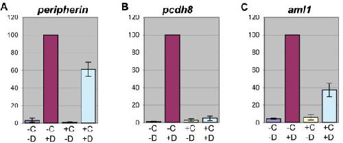 Figure 6. The identification of direct and indirect candidate targets of EBF3 by RT-QPCR. hGR-XEBF3 mRNA and Noggin mRNA were injected into one-cell stage embryos, and animal caps were collected at the blastula stage (stage 9). The animal caps were divided into four groups, based on CHX and DEX treatment: -C-D, -C+D, +C-D, and +C+D. After a 3.5-hour incubation with CHX and/or a 3-hour incubation with DEX, total RNA was isolated from each animal cap group. RT-QPCR was conducted with the isolated total RNA. The expression level was normalized with the expression level of histone h4 and then normalized to the expression level of -C+D, for each gene, at 100 arbitrary units. (A-C) The expression levels of all candidate target genes in controls (-C-D and +C-D) are very low compared to the DEX-treated condition of -C+D. (A) The expression level of peripherin in +C+D (61%) is only partially reduced compared to -C+D, indicating that the majority of its expression is controlled by EBF3 directly. (B) The expression level of pcdh8 in +C+D (5%) is much lower than in -C+D and is similar to the levels of the control conditions, indicating that it is an indirect candidate target. (C) The expression level of aml1 in +C+D (37%) is lower than the expression level in -C+D but higher than levels of the control conditions, indicating that its expression is partially controlled by EBF3 directly. Error bars represent standard error of the mean. The results for the remaining candidate target genes are shown in Additional file 6. N = 3 replicates, 20 to 30 animal caps per condition. |