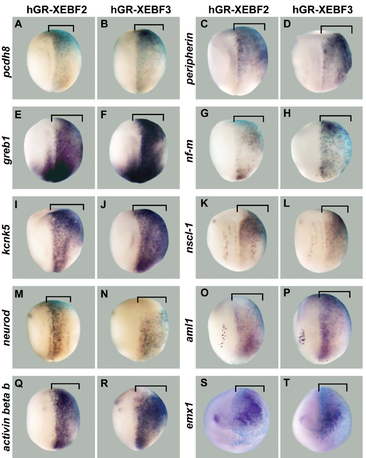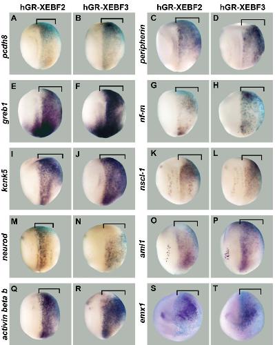 Figure 1. Candidate target genes upregulated by overexpression of EBF2 or EBF3. hGR-XEBF2 or hGR-XEBF3 mRNA was injected into one cell of two-cell stage embryos, followed by DEX treatment from the late gastrula stage (stage 11/11.5) to the neurula stage (stage 14/15). β-Galactosidase (β-gal) mRNA was co-injected as a marker of the injected side. In all panels the right side is the injected side, showing the light blue color of X-gal staining. (A-T) The expression levels of pcdh8 (A,B), peripherin (C,D), greb1 (E,F), nf-m (G,H), kcnk5 (I,J), nscl-1 (K,L), neurod (M,N), aml1 (O,P), activin beta b (Q,R), and emx1 (S,T) are strongly upregulated by EBF2 and EBF3 (brackets). Panels (A-R) show dorsal views, while (S,T) show anterior views. |