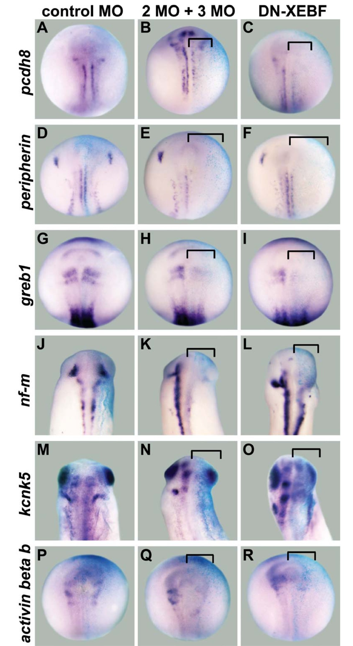 Figure 3. Downregulation of non-transcription factor candidate target genes after knockdown of EBF2 and EBF3. One cell of two-cell stage embryos was injected with either control MO, both EBF2 MO and EBF3 MO (2MO + 3MO), or dominant negative Xenopus EBF3 (DN-XEBF) mRNA. β-Galactosidase (β-gal) mRNA was co-injected as a marker of the injected side. In all panels the right side is the injected side, showing the light blue color of X-gal staining. (A-R) The expression of pcdh8 (B,C), peripherin (E,F), greb1 (H,I), nf-m (K,L), kcnk5 (N,O), and activin beta b (Q,R) is downregulated by EBF2 MO and EBF3 MO, and by DN-XEBF (brackets), while control MO does not change their expression levels (A,D,G,J,M,P). Panels (A-I) and (P-R) are neurula stage embryos (stage 15/16), and (J-O) are tail bud stage embryos (stages 25 to 28). All panels show dorsal views. |
