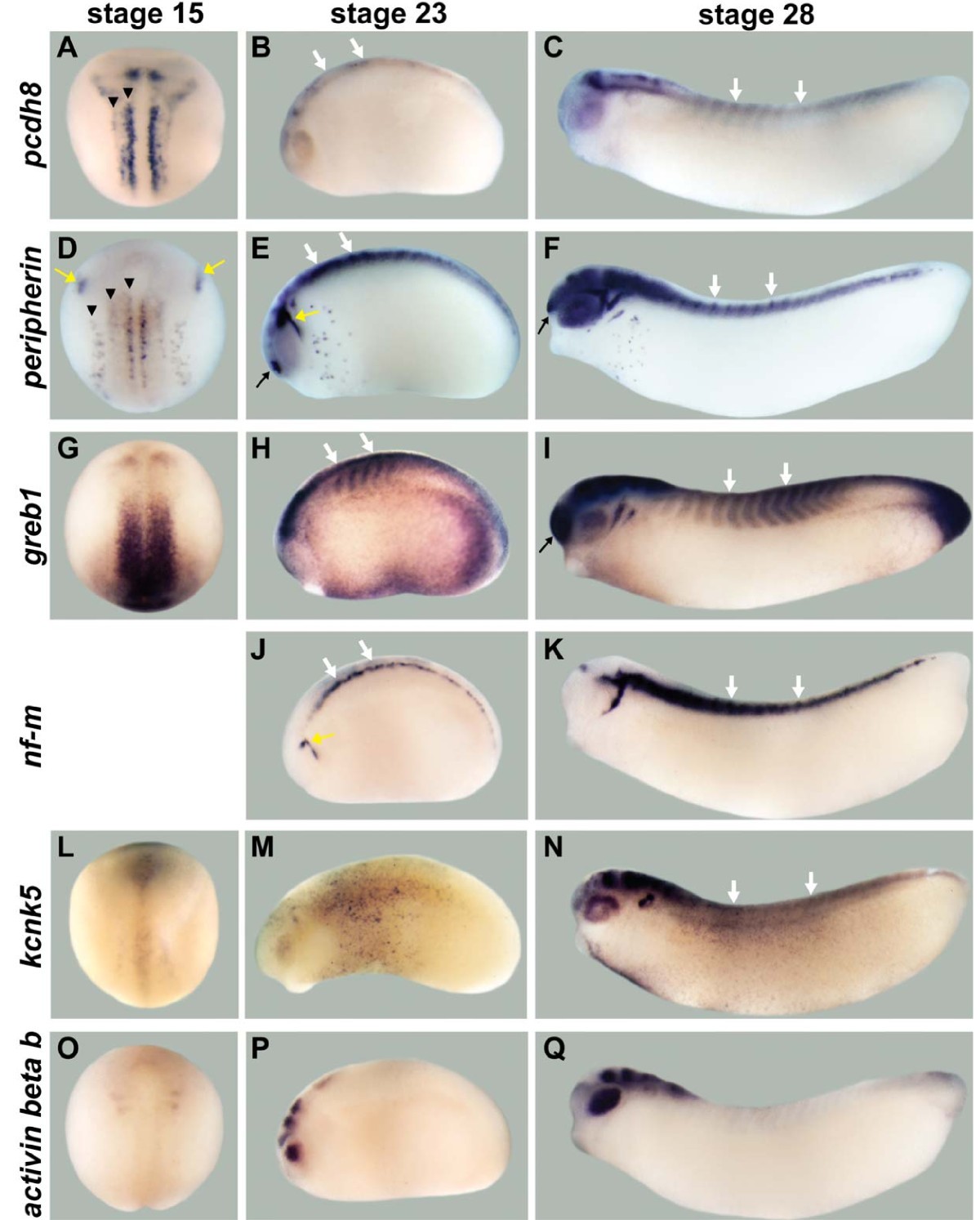 Figure 5. Neuronal expression for non-transcription factor candidate target genes. (A-C) pcdh8 is expressed in medial and intermediate stripes (arrowheads) of primary neurons, in one posterior stripe between the two stripes of primary neurons, and in the anterior domain of the neural plate at stage 15, and in the spinal cord (white arrows) and some domains in the brain at stages 23 and 28. (D-F) peripherin is expressed in the trigeminal placodes (yellow arrows) and three stripes of primary neurons (arrowheads) at stage 15, and in the trigeminal placodes, olfactory placodes (black arrow), spinal cord, retina and many domains in the brain at stages 23 and 28. (G-I) greb1 is expressed as a band in the prospective midbrain/hindbrain region at stage 15, and in the midbrain/hindbrain region and spinal cord at stage 23, and in the olfactory placodes, spinal cord, and many domains in the brain at stage 28. (J,K) nf-m is not expressed at stage 15, but at stages 23 and 28 it is expressed in the trigeminal placodes and spinal cord. (L-N) kcnk5 is weakly expressed from anterior to posterior along the dorsal midline, with stronger expression in the anterior end of the neural fold at stage 15. It is expressed in retina, otic placode, and several domains in the brain at stages 23 and 28, and in spinal cord at stage 28. (O-Q) activin beta b is expressed in two bands in the prospective midbrain/hindbrain region and diffusely throughout the anterior neural plate at stage 15, and it is expressed in the retina and some brain domains at stages 23 and 28. Stage 15 embryos show dorsal views, and stages 23 and 28 embryos show lateral views. |