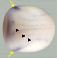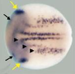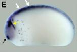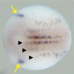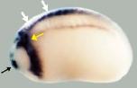 nhlh1 (nescient helix loop helix 1) gene expression in Xenopus laevis embryos, NF stage 23, as assayed by in situ hybridization,lateral view: dorsal up, anterior left. Note trigeminal placode (yellow arrow), olfactory placode (black arrow), domains of the spinal cord (white arrows) |