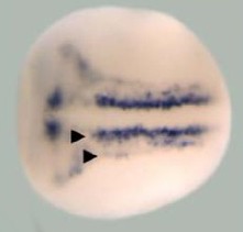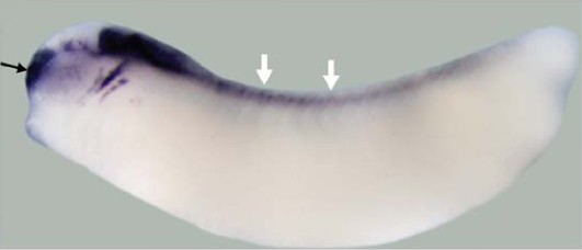 ebf2 (early B-cell factor 2) gene expression in Xenopus laevis embryos, NF stage 28, as assayed by in situ hybridization, lateral view, dorsal up, anterior left. Key: olfactory placode (black arrow); spinal cord (white arrows) |