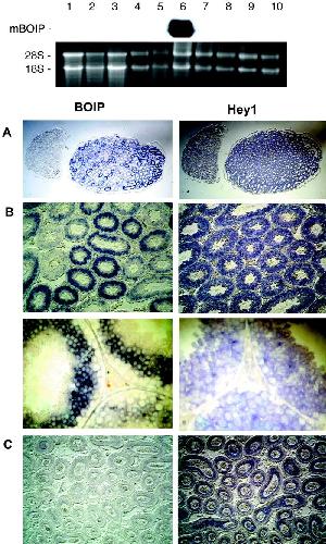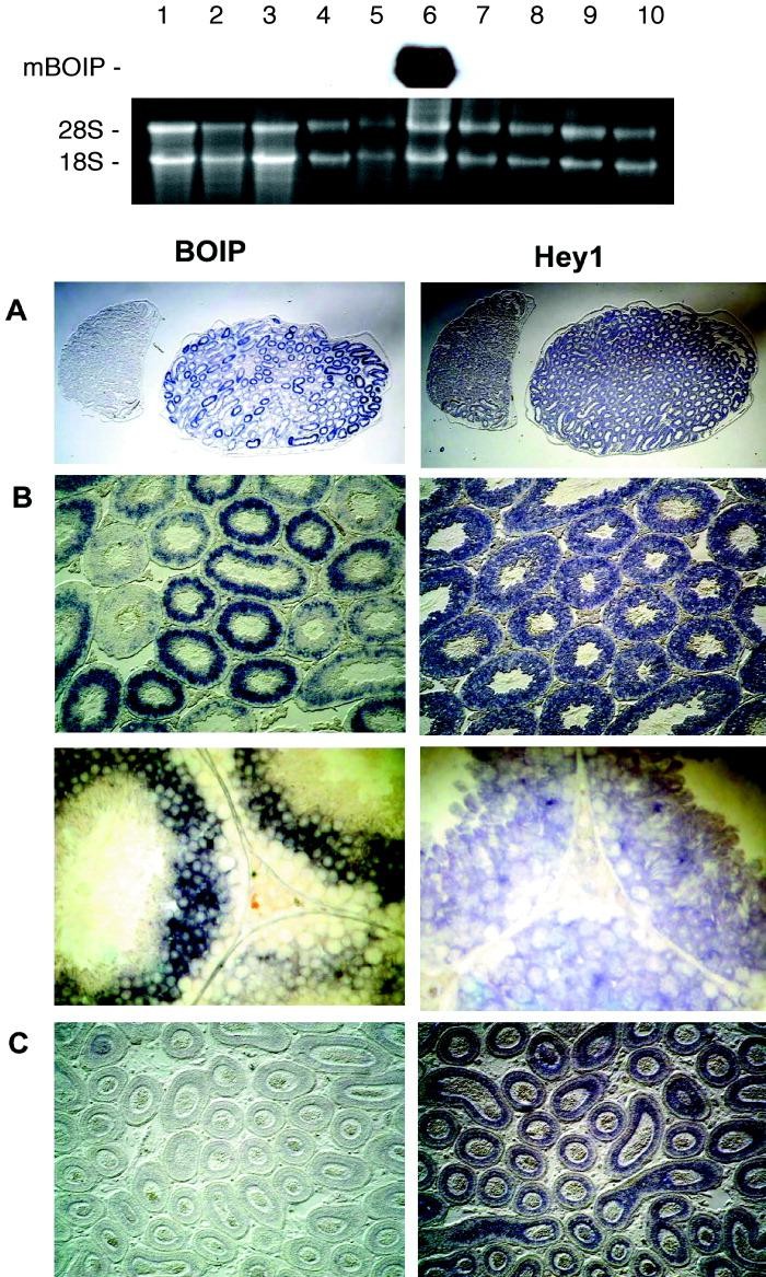 Figure 6. bc8 Orange interacting protein (BOIP) mRNA expression in adult organs. Top panel: RNAase protection analysis of BOIP expression in adult mouse tissue. Fifteen micrograms of RNA were loaded per lane: spleen (1), lung (2), liver (3), heart (4), brain (5), testis (6), hypophysis (7), salivary gland (8), kidney (9), muscle (10). As a control, ethidium bromide staining of the RNA loaded on an agarose gel is shown. Bottom panels: In situ analysis of BOIP and Hey1 (HRT1) RNA expression in murine testis. A: An overview shows expression of both genes in testis, whereas in epididymis only Hey1 (HRT1) is seen. B: In seminiferous tubules, BOIP is coexpressed with Hey1 (HRT1) in round spermatids. As spermatogenesis is a periodic process, round spermatids can only be found in certain parts of the seminiferous tubule, so in sections, just a limited number of tubules will contain this cell population. In contrast to BOIP, Hey1 (HRT1) is expressed in all cells. C: Hey1 (HRT1) is also strongly expressed in the epithelia of the epididymis, where BOIP is absent.
