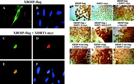 XHRT1 protein with the Orange domain deleted (K) or Hairy2b (L), Flag staining is detected