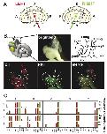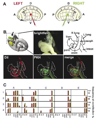 Fig. 1. Contributions of the left and right lateral plate mesoderm to the digestive organs. A: Diagram of bilateral labeling experiment. Individual squares are designated with a letter and number to indicate their relative dorsoventral (1� 4) and anteroposterior (A�E) position in the lateral plate mesoderm (LPM). D, dorsal; V, ventral; A, anterior; P, posterior. B: The fate of left and right squares A3. The region of the gut shown in brightfield is boxed in the model of the stage 45 gut (upper left). The arrow in the box indicates the anterior view of the slightly rotated and flat-mounted foregut organs shown in the photomicrographs. The fluorescence of the left (DiI) and right (PKH) dyes are shown individually and merged. The orientation of specific organs is indicated in the diagram in the upper right. Faint signals in the intestine are autofluorescence. R, right; L, left; esoph, esophagus; panc, pancreas; stom, stomach; intest, intestine. C: Comparison of the frequency of contribution of the left and right LPM to the digestive system, presented as the percentage of cases in which individual left (orange) and right (green) labeled squares contributed to the different digestive organs at stage 45�46. The coordinates of each labeled square are indicated above and to the left of the graphs, with individual organs indicated below. dp, dorsal pancreas; vp, ventral pancreas; liv, liver; eso, esophagus; stom, stomach; duod, duodenum; int, intestine. |
