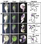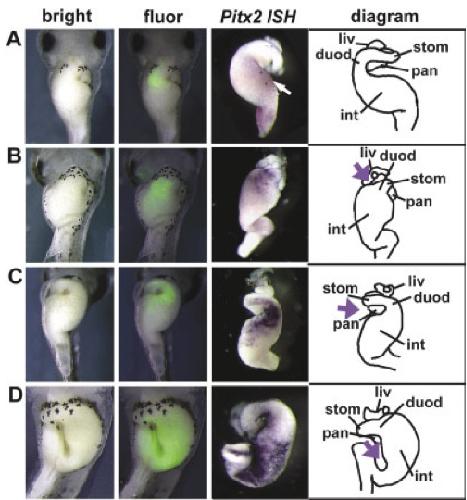 Fig. 4. Ectopic Pitx2 mRNA induces concavities in the gut tube. Embryos were injected with fluorescein dextran (FLDx) alone or in combination with Pitx2 mRNA. At sibling stage 42� 44, embryos were photographed in ventral view using brightfield (bright) and fluorescence (fluor) microscopy, after which guts were isolated and subjected to RNA in situ hybridiza- tion to confirm the presence of ectopic Pitx2 mRNA (Pitx2 ISH). Schematic diagrams of the guts are shown, with individual organs labeled, and ectopic Pitx2 expression domains and areas of abnormal topology indicated by purple arrows. duod, duodenum; int, intestine; liv, liver; pan, pancreas; stom, stomach. A: Control FLDx-injected embryo with normal gut morphology and endogenous Pitx2 expression. Note that Pitx2 is normally expressed bilaterally in the hindgut but only on the left side of the midgut (arrow), in the prospective concavity of the nascent midgut (MG) loop. B: Embryo expressing ectopic Pitx2 mRNA in anterior right foregut, with a small, ectopic right-side concavity (arrow) in the biconcave gastroduodenal (GD) loop and heterotaxic positioning of foregut organs. C: Embryo expressing ectopic Pitx2 mRNA on the right side of the duodenum, with a completely reversed GD loop and foregut organs. D: Embryo expressing ectopic Pitx2 mRNA on the right side of the midgut. A large midgut concavity consumes the right side of the gut tube, reversing the MG loop, and distorting the GD loop. (The Pitx2 ISH expression pattern is shown in right-side view.) |