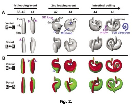 Fig. 2. Symmetry breaking events in Xenopus digestive organ morphogenesis. A: Three- dimensional cartoons of the key symmetry-breaking morphogenetic events in isolated gut tubes at stages 38�41 (first looping event), 42�43 (second looping event), and 44�45 (intestinal coiling), presented in both ventral and dorsal views. Large scale morphogenetic movements are indicated by black arrows. Open arrowheads indicate the key convex surfaces and filled arrowheads the key concavities of the forming gastroduodenal (GD, purple) and midgut (MG, blue) loops. Asterisks indicate the apex of the MG loop as ascertained by fate mapping studies (data not shown). Final coil origin and coil direction are indicated at stage 45. For clarity, some additional coiling of the hindgut has been omitted from the dorsal view of the stage 45 model. See text for details. fore, foregut; mid, midgut; hind, hindgut; eso, esophagus; st, stomach; duod, duodenum. B: Models of the topologic distribution of the descendants of the left (orange) and right (green) lateral plate mesoderm within the gut tube at stages 40�45. Key concave and convex surfaces are indicated by filled and open arrowheads, respectively, as in A. |
