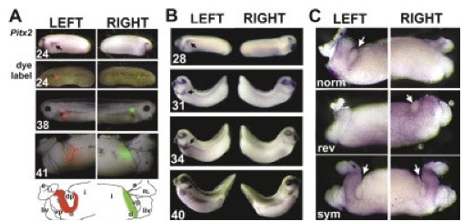 Fig. 3. The role of Pitx2 expression in gastroduodenal (GD) looping. A: At stage 24, Pitx2 is expressed in a defined region of the left (arrow) but not right lateral plate mesoderm (LPM), as indicated by RNA in situ hybridization (top panels). Dye-labeled cells within the Pitx2- expressing region in the left LPM will populate the concavity of the GD loop by stage 40 � 41, while cells from the right LPM occupy a convex surface. Schematic drawings of the left and right sides of a stage 41 gut are shown in the bottom panels. d, duodenum; dp, dorsal pancreas; e, esophagus; i, intestine; liv, liver; LL, left lung; RL, right lung; s, stomach; vp, ventral pancreas. B: Expression profile by RNA in situ hybridization of Pitx2 (arrows) in left and right LPM at stages 28�40. C: Isolated gut tubes from heptanol-treated embryos were fixed at stage 40 and subjected to RNA in situ hybridization with a probe for Pitx2. The positions of the GD loop concavities are indicated by arrows. norm, normal; rev, reversed; sym, symetrical. |