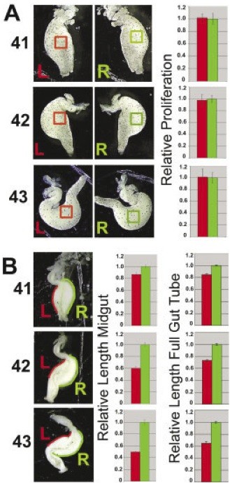 Fig. 5. The left (L) and right (R) sides of the gut elongate at different rates, with no dif- ference in proliferation. A: The number of mitotic cells on the left and right sides of isolated stage 41, 42, and 43 gut tubes was detected with an anti-phosphohistone H3 antibody. The number of mitotic cells within a fixed square area on each side was av- eraged over multiple samples for each stage. Relative proliferation was deter- mined by arbitrarily setting the number of mitotic cells on the right side to a value of 1. B: The lengths of the left and right sides of the midgut (indicated by the orange and green outlines; photos are not to scale) of stage 41, 42, and 43 embryos were digitally measured. Relative mean lengths were de- termined by arbitrarily setting the right side mean to a value of 1. For comparison, the relative mean lengths of the entire left and right sides of the full gut tube were also measured. |