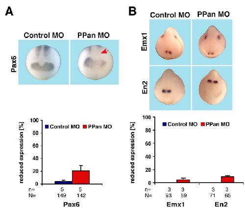 Fig. 4. PPan functions in early eye field induction. (A) Expression of Sox3, Rx1 and Pax6 was analyzed at stage 13. PPan-depleted Xenopus embryos exhibit reduced expression of Rx1 and Pax6 in the eye field (arrows). (B) At stage 23, expression of Otx2, Rx1 and Pax6 was strongly reduced upon PPan MO injection and slightly reduced upon ITS2 MO injection on the affected side (arrows). Quantitative evaluations are given beneath. n, number of independent experiments; N, total number of embryos examined. Error bars indicate s.e.m. |