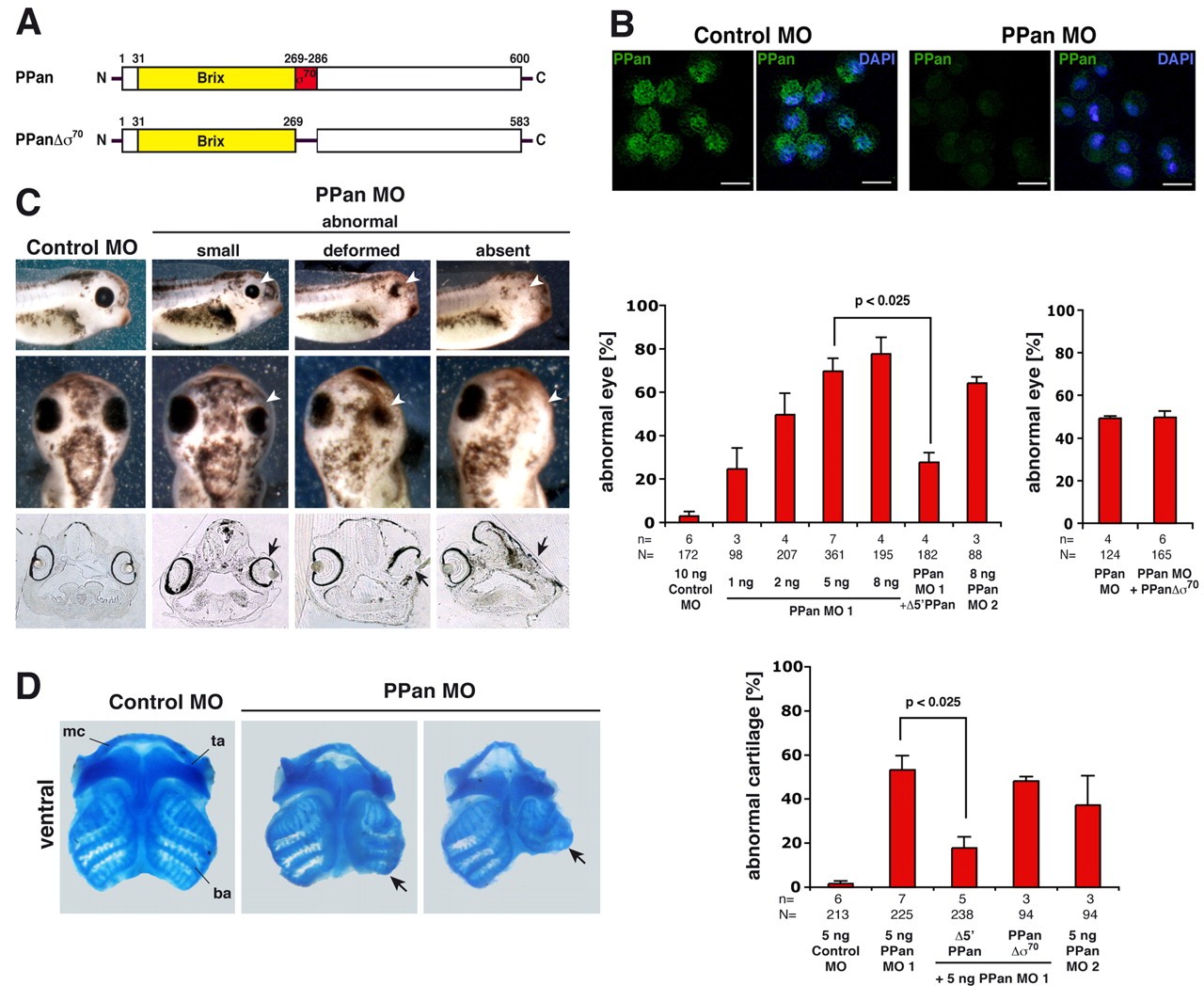 Fig. 2. Loss of PPan function strongly affects eye and craniofacial cartilage formation. (A) Schematic of Xenopus PPan protein illustrating the Brix domain (yellow) and Ï70-like motif (red). Beneath is illustrated the Ï70 deletion construct PPanδÏ70. (B) Endogenous PPan is strongly reduced in cells derived from PPan MO-injected Xenopus animal caps (ACs), as compared with Control MO-injected ACs. Scale bars: 20 μm. (C,D) PPan MO1 and MO2, but not Control MO, injection results in a severe eye (C) and cranial cartilage (D) phenotype on the injected side (arrowheads and arrows) in a dose-dependent manner. Co-injection of δ5â²UTR PPan RNA rescues PPan MO1-induced phenotypes, whereas PPanδÏ70 does not. ba, branchial arches; mc, Meckel's cartilage; ta, tectum anterius. Quantitative evaluations are given to the right. n, number of independent experiments; N, total number of embryos examined. Error bars indicate s.e.m. |