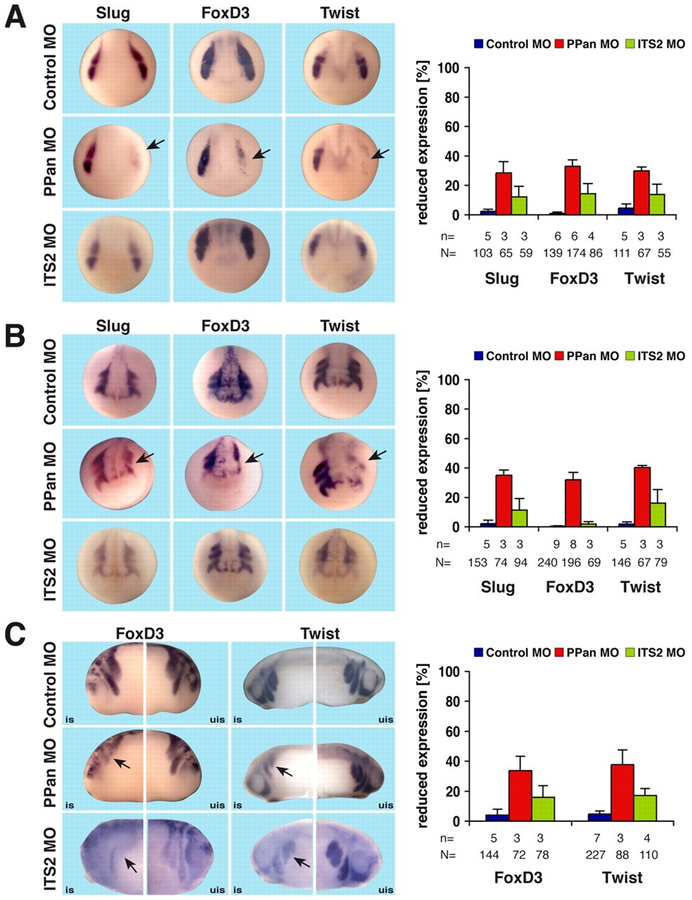 Fig. 5. PPan depletion results in defects in NC induction. (A-C) To study the behavior of NCCs upon PPan MO or ITS2 MO injection, Slug, FoxD3 and Twist expression was analyzed. Slug, FoxD3 and Twist expression at stages 16/17 (A) and 20 (B) as well as FoxD3 and Twist expression at stage 23 (C) was reduced on the injected side upon PPan depletion, whereas ITS2 MO injection had little or no effect on NC specification and migration (arrows). Quantitative evaluations are given to the right. n, number of independent experiments; N, total number of embryos examined. Error bars indicate s.e.m. |
