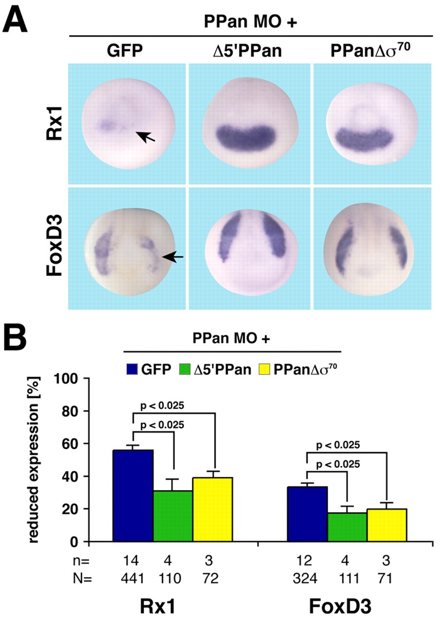 Fig. 6. δ5â²UTR PPan and PPanδÏ70 rescue defects in marker gene expression caused by PPan MO. (A) Co-injection of either 2 ng δ5â²UTR PPan or 2 ng PPanδÏ70 rescued the effect of 5 ng PPan MO on Rx1 expression at stage 13 and FoxD3 expression at stage 16 (arrows). (B) Quantification of the experiment in A. n, number of independent experiments; N, total number of embryos examined. Error bars indicate s.e.m. |