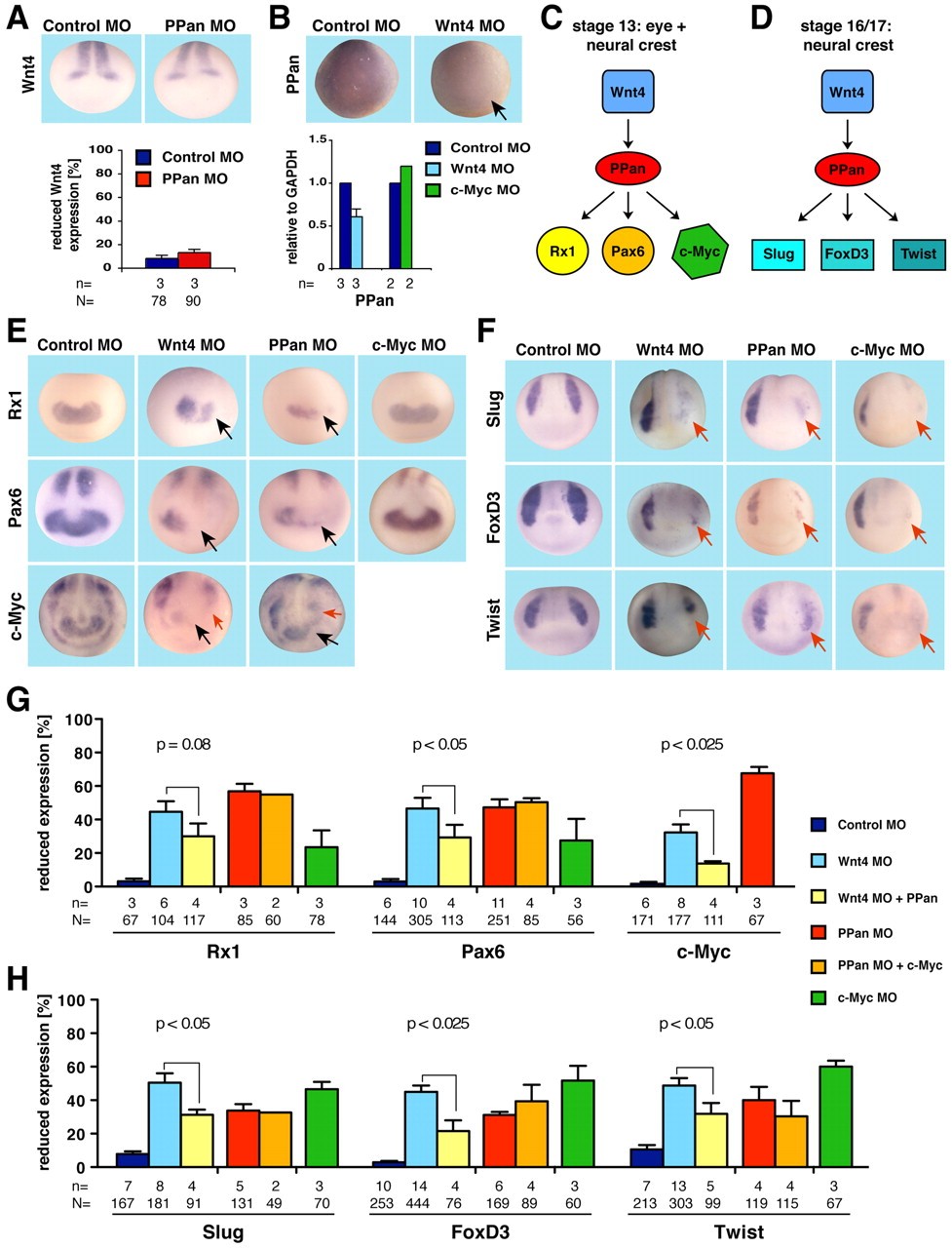 Fig. 7. PPan acts downstream of Wnt4. (A) PPan MO injection has no effect on Wnt4 expression at stage 13. (B) Representative Xenopus embryos displaying reduced expression of PPan at stage 13 upon bilateral injection of 20 ng Wnt4 MO (animal-dorsal, 8-cell stage). For qRT-PCR analyses, embryos were injected with noggin RNA (200 pg) and Wnt4 MO (3 ng) or c-Myc MO (10 ng) bilaterally at the 2-cell stage. Noggin-induced neuralized ACs were dissected and cultured to the equivalent of stage 13. Data are presented as relative units normalized to Control MO-injected samples. (C) Hypothesis I. PPan acts downstream of Wnt4 and upstream of Rx1, Pax6 and c-Myc at stage 13 in the context of eye and NC development. (D) Hypothesis II. PPan acts between Wnt4 and NC-specific genes during NC induction. (E) Unilateral PPan MO as well as Wnt4 MO injection interfere with Rx1, Pax6 and c-Myc expression on the injected side (black arrow, eye; red arrow, NC) at stage 13. By contrast, c-Myc MO has only a slight effect on Rx1 and Pax6 expression. (F) Wnt4, PPan and c-Myc depletion lead to a similar downregulation of the NC marker genes Slug, FoxD3 and Twist at stage 16/17. (G,H) Quantification of the experiments in E (G) and F (H). Co-injection of PPan RNA rescues Wnt4 MO-induced reduction of all analyzed eye and NC marker genes. By contrast, co-injection of c-Myc RNA does not revert PPan MO-induced effects. n, number of independent experiments; N, total number of embryos examined. Error bars indicate s.e.m. |