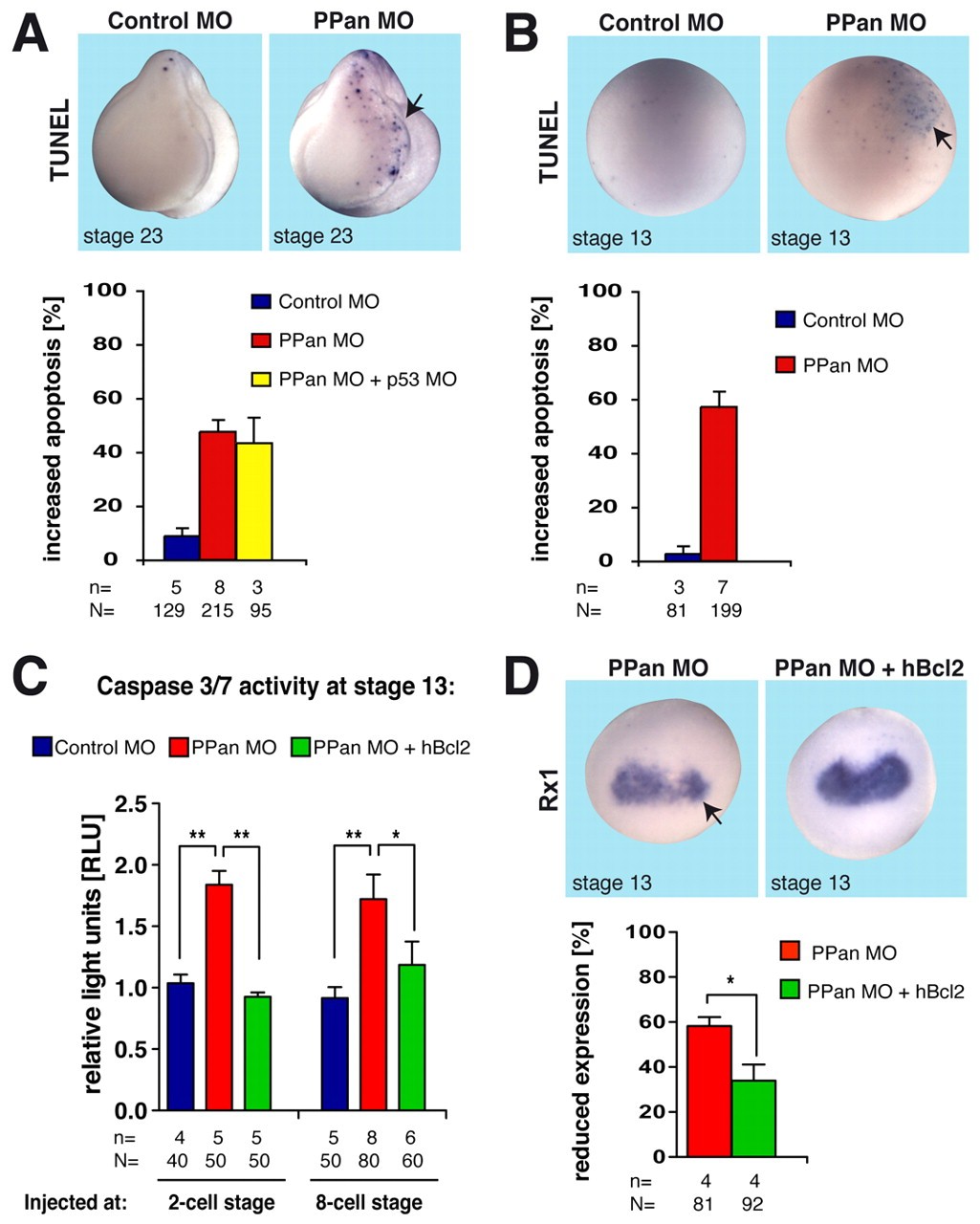 Fig. 8. PPan has a function in apoptosis. (A) Eight-cell stage Xenopus embryos were injected with PPan MO (5 ng) or Control MO (5 ng) into one animal-dorsal blastomere. TUNEL staining was used to label apoptotic cells. PPan depletion results in increased apoptosis on the manipulated side at stage 23 (arrow), which could not be rescued by co-injection of p53 MO (5 ng). Control MO-injected embryos were not affected. A quantitative evaluation is given beneath. (B) The increase in apoptosis can already be observed at stage 13. (C) Bilateral injection of 40 ng PPan MO at the 2-cell stage leads to increased activity of caspases 3 and 7. This effect can be reverted by co-injection of 4 ng human (h) BCL2 RNA. The same effect was observed upon injection (bilateral, animal-dorsal) of 10 ng PPan MO and 2 ng human BCL2 RNA at the 8-cell stage. Values represent relative light units (RLU) normalized to one Control MO-injected sample per series of experiments. (D) Co-injection of 1 ng human BCL2 RNA into one animal-dorsal blastomere at the 8-cell stage rescued the PPan MO-induced reduction of Rx1 expression (arrow). **, P<0.01; *, P<0.05. n, number of independent experiments; N, total number of embryos examined. Error bars indicate s.e.m. |