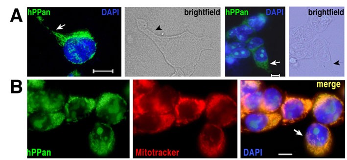 Fig. S10. PPan is located in the mitochondria. (A) Comparison of PPan immunostainings and brightfield images clarify the localization of PPAN in extranuclear compartments of HEK293 cells (arrows). (B) Counterstaining of the mitochondria using MitoTracker Red CMXRos revealed that PPAN is located in the mitochondria. The arrow points to the cell shown in Fig. 9. Scale bars: 10 . |
