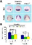 Fig. S7. c-Myc knockdown phenocopies PPan depletion. (A) c-Myc expression monitored from stage 11 to 16 and later stages. c-Myc transcripts are located in the prospective neural crest region first detectable at stage 11 and, in addition, in the eye field first visible at stage 13. At later stages, c-Myc has expression domains similar to those of PPan, e.g. in the branchial arches, the eye, the pronephros the forebrain and midbrain, the hypaxial muscles and the blood islands. (B,C) c-Myc MO (Bellmeyer et al., 2003) was injected into one animal-dorsal blastomere at the 8-cell stage. c-Myc depletion results in severe eye (B) and craniofacial cartilage (C) defects (arrows) in a dose-dependent manner. n, number of independent experiments; N, total number of embryos examined. Error bars indicate s.e.m. |