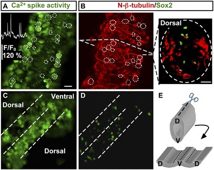 Fig. 1. Spiking cells in the developing neural tube are postmitotic neurons. (A) Ca2+ imaging of the ventral spinal cord of a stage-24 (26-h-postfertilization) embryo for 20 min. Circles identify cells spiking during 20-min recording. Inset shows Ca2+ spike activity for the cell outlined in yellow. (B) (Left) After imaging, the same preparation was whole-mount immunostained for Sox2 and N-β-tubulin. (Right) Immunostaining of a transverse section of the spinal cord from a stage-24 embryo. (C) Ca2+ imaging of an open-book spinal cord preparation. (D) Whole-mount immunostaining of the same preparation for Sox2 and N-β-tubulin. (E) Diagram of the open-book spinal cord preparation shown in C and D. D, dorsal; V, ventral. (Scale bars, 20 μm.)