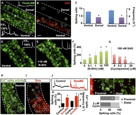 Shh increases Ca2+ spike activity of developing spinal neurons. (A) Lateral view of a developing spinal cord showing higher levels of Ca2+ spike activity in the ventral than in the dorsal neural tube (stage 24). (B) After imaging, the same preparation was whole-mount immunostained for homeodomain protein Hb9, a ventrally expressed neuronal marker, to indicate its dorsoventral orientation. Circles identify cells spiking during 20-min recording, and Insets in A show Ca2+ spike activity for cells outlined in yellow. (C) Incidence of spiking cells per neural tube and frequency of Ca2+ spikes in ventral and dorsal spinal neurons. (D and E) Ventral view of stage-24 developing spinal cord in the absence (D) or presence (E) of N-Shh. Insets show Ca2+ spike activity during 15-min recording from the same cell (outlined in yellow). (F) Doseesponse curve for N-Shhnduced Ca2+ spike activity. Data are mean SEM percent of spiking cells in the presence of N-Shh compared to number of cells spiking before addition of N-Shh (0). (G) Doseesponse curve for cyclopamine blockade of Ca2+ spike activity induced by SAG. Data are mean SEM percent of spiking cells in the presence of SAG and cyclopamine compared to number of cells spiking before addition of cyclopamine (0). (H) Expression of SmoM2 increases Ca2+ spike activity. (H) Electroporation of a stage-19 embryo with SmoM2 demonstrates a higher incidence of Ca2+ spike activity 6 h after electroporation (stage 24) in electroporated cells (red) than in nonelectroporated cells (black). (I) Effective overexpression of SmoM2 was verified by whole-mount immunostaining against Smo after Ca2+ imaging. Circles identify cells spiking during recording. (J) Ca2+ spike activity during 20-min recording for immunonegative and immunopositive cells outlined in yellow in H and I. (K) Bar graphs show mean SEM percent incidence of spiking cells and spike frequency for electroporated (SmoM2) and nonelectroporated (Control) cells. n = 5 stage-24 (26-h postfertilization) embryos per experimental group (C). (L) Endogenous Shh released by the notochord increases Ca2+ spike activity of neurons. (Upper) Dissociated neuron/notochord explant (Not) coculture. (Lower) The imaged field was divided in halves proximal and distal to the notochord explant. Values are mean SEM percent of spiking cells in proximal and distal regions in the absence or presence of cyclopamine (Cyclo). n = 5 independent cultures; *P < 0.05. (Scale bars, 20 μm.)