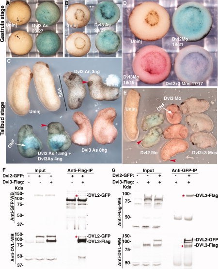 Figure 2. Non-redundant requirement of maternal Dvl2 and Dvl3 for early development. AâC: Phenotypes of embryos from thioate antisense oligo (Dvl2AS and /or Dvl3AS) -injected oocytes. A,B: Delayed appearance and closure of the blastopore in Dvl3-depleted (Dvl3AS, Blue) embryos as compared to controls (Uninj, Brown; arrow indicates the blastopore lip). Depleting Dvl2 causes the same phenotype. C: Dvl2 (mauve), Dvl3 (red), or Dvl2 and 3 (blue) -depleted neurulae develop shortened body axis (SBA), open neural folds (ONF), and reduced heads (red arrowheads). D,E: Phenotypes of embryos from morpholino antisense (Dvl2Mo and/or Dvl3Mo) injected oocytes. D: Dvl2Mo- (blue), Dvl3Mo- (red), and Dvl2 + 3Mos-injected gastrulae have delayed blastopore closure. E: Dvl-depleted neurula are shorter than controls (brown), have small heads (red arrowheads) and open neural folds (ONF). F,G: Physical interaction between Dvl2-GFP- and Dvl3-Flag-tagged proteins. F: A Dvl2-GFP band (â 125 Kda, red stars) is present in the anti-Flag immunocomplex from Dvl2-GFP + Dvl3-Flag co-injection and absent in the immunocomplex from Dvl2-GFP single injection. G: A Dvl3-Flag band (â 80 Kda, red stars) is present in the anti-GFP immunocomplex from Dvl2-GFP + Dvl3-Flag co-injection and absent in the immunocomplex from Dvl3-Flag single injection. The inputs are one embryo and the IPs are from 40 embryos.Download figure to PowerPoint