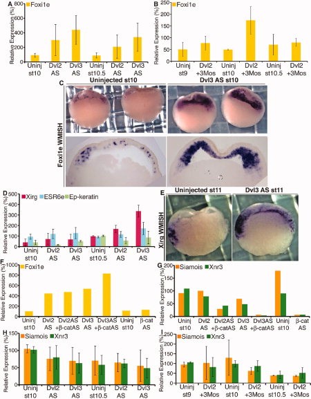 Figure 3. Gene specific up-regulation of ectodermal markers and minor effect on canonical Wnt target genes upon maternal depletion of Dvl2 and Dvl3. A: Up-regulation of Foxi1e in Dvl2 and Dvl3 antisense-injected embryos. B: Up-regulation of Foxi1e in embryos injected with a Dvl2 and Dvl3 morpholinos mixture (30 ng each). Eight and three independent experiments were averaged in A and B, respectively. C: WMISH of Foxi1e on bisected embryos (top) and sagittal sections (bottom). Foxi1e is no longer restricted to only some cells of the deep layer of the animal pole in Dvl3-depleted embryos (Dvl3AS, bottom right) as compared to controls (Uninjected, bottom left). D: Significant up-regulation of Xirg but not ESR6e and Epidermal Keratin (Ep-Keratin) in Dvl2- and 3-depleted embryos. Four independent experiments were averaged. E: Expansion of Xirg WMISH signal in bisected Dvl3-depleted embryos. Depletion of Dvl2 causes the same effects shown in C and E. F: Concomitant depletion of β-Catenin has no effect on Foxi1e up-regulation in Dvl-depleted embryos, and depletion of β-Catenin alone does not up-regulate Foxi1e. G: Analysis of Siamois and Xnr3 in the same samples as in F. H,I: Minor effect on Siamois and Xnr3 in the same samples as in A and B, respectively.Download figure to PowerPoint