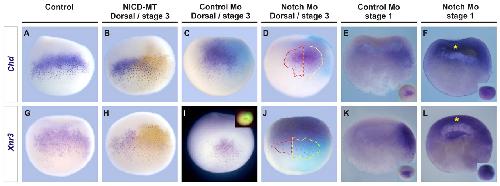 Fig. 1. Notch restricts the expression of blastula chordin- and noggin-expressing centre (BCNE) markers to the dorsal region. Expression of chd (A-F) and Xnr3 (G-L) in stage 9 Xenopus embryos. (A,B,G,H) Embryos injected with 1 ng of nicd-mt mRNA into a dorsal cell at the 4-cell stage (stage 3; B,H) and control siblings (A,G). Brown dots correspond to horseradish peroxidase immunolocalisation of the c-myc epitope fused to the intracellular domain of Notch (NICD). (C,D,I,J) Embryos injected with 20 ng of control morpholino (Mo; C,I) or Notch Mo (D,J) into a dorsal cell at stage 3. The injected side was revealed by alkaline-phosphatase immunostaining of the fluorescein tag (BCIP, turquoise staining in C,D,J) or by immunofluorescence (inset in I). Red and yellow dotted lines depict the area of expression of the BCNE markers on the non-injected and on the injected side, respectively. (E,F,K,L) Hemisectioned embryos injected with 20 ng of control Mo (E,K) or Notch Mo (F,L) before the first cleavage. The dorsal side is oriented to the right, animal up. Insets in E, F, K and L show the corresponding whole embryos. Whole embryos are shown in dorsal views, animal up. |