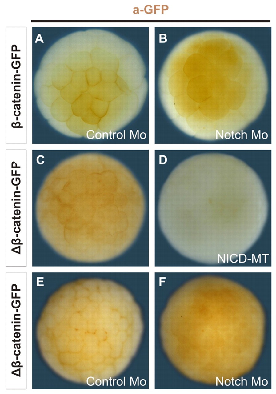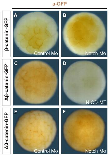 Fig. 6. Endogenous Notch can decrease the steady state levels of β-catenin before midblastula transition (MBT) through a mechanism that does not require its phosphorylation by GSK3. (A-F) Immunodetection of the GFP tag of β-catenin-GFP (A,B) or the GFP tag of δβ-catenin-GFP (C-F). Xenopus embryos were injected before the first cleavage with 1 ng of β-catenin-GFP mRNA + 20 ng of control morpholino (Mo; A), 1 ng of β-catenin-GFP mRNA + 20 ng of Notch Mo (B), 1 ng of δβ-catenin-GFP mRNA (C), 1 ng of δβ-catenin-GFP mRNA + 1 ng of nicd-mt mRNA (D), 1 ng of δβ-catenin-GFP mRNA + 20 ng of control Mo (E) or 1 ng of δβ-catenin-GFP mRNA + 20 ng of Notch Mo (F). All embryos were co-injected with DOG as tracer and classified by fluorescence. Animal views of embryos fixed at early blastula (stage 6.5-7) were photographed in PBS. |