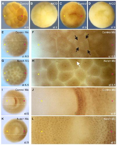 Fig. 7. Notch modulates the levels and the intracellular distribution of endogenous β-catenin. (A-L) Immunolocalisation of endogenous β-catenin in whole Xenopus embryos. Embryos were injected before the first mitotic division with 1 ng of nicd-mt mRNA (B,D), 20 ng of control morpholino (Mo; E,F,I,J) or 20 ng of Notch Mo (G,H,K,L). Injected embryos and their corresponding uninjected siblings (A,C) were fixed at early blastula (A,B,E-H) and late blastula (C,D,I-L) and were processed for whole-mount immunohistochemistry with an antibody raised against the last C-terminal 14 amino acids of β-catenin (brown). All embryos are shown in animal views, with the dorsal side oriented to the right, except in B, where it was not possible to assign the dorsal-ventral (D-V) orientation. F, H, J and L are magnifications of the area enclosed by the rectangular frame in E, G, I and K, respectively. Embryos were photographed in PBS (A-D) or in 75% Murray's solution in methanol (E-L). Uninjected controls (A,C) or embryos injected with control Mo (E,I) show a D-V gradient of β-catenin immunoreactivity, with fainter levels ventrally (yellow asterisks) and maximum levels dorsally (red asterisks). Notch Mo increased the levels of β-catenin protein on the ventral side relative to control Mo-injected siblings (compare yellow asterisks in E,F and G,H for stage 6.5 and in I,J and K,L for stage 9). Black and white arrows indicate the distribution of β-catenin in the peripheral cytoplasm and in the nuclei, respectively. |