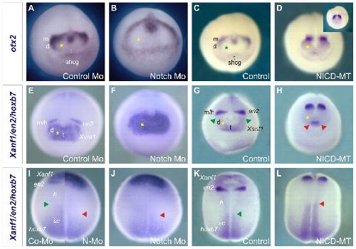 Fig. 8. Attenuation of Notch from the beginning of development produces an expansion of the brain, whereas gain of function of Notch produces the opposite results. (A-L) Expression of anterior-posterior (A-P) neural markers at stage 14 (A,B,E,F,I,J) or stage 15 (C,D,G,H,K,L). Xenopus embryos were injected prior to the first mitotic cleavage in the animal hemisphere with 20 ng of control morpholino (Mo; A,E, left side of I), 20 ng of Notch Mo (B,F,J, right side of I) or 1 ng of nicd-mt RNA (D,H,L). Embryos injected with control Mo and Notch Mo are siblings. C, G and K are the corresponding uninjected sibling controls of D, H and L, respectively. Specimens were processed for whole-mount in situ hybridisation for the following markers: otx2 (A-D); Xanf1, en2 and hoxb7 (E-L). A-H show anterior views, dorsal up. I-L show dorsal views, anterior up. The inset in D shows the expression of otx2 in a more severely affected nicd-mt RNA-injected embryo. I is a photocomposition showing a control Mo (Co-Mo)-injected embryo (left) and a Notch Mo (N-Mo)-injected sibling (right). F, right side of I and J show Notch Mo-injected embryos displaying different grades of expansion of the Xanf1 territory, with gradual extinction of the en2 stripes and caudal shift of the hoxb7 domain. Asterisks in A-C highlight the expression hole encircled by otx2, coincident with the area of expression of Xanf1 (asterisks in E-G). Red arrowheads in H indicate the reduction of the Xanf1 domain in nicd-mt RNA-injected embryos relative to control siblings (G, green arrowheads). Red arrowheads in I and J indicate the posterior shift of the hoxb7 domain in Notch Mo-injected embryos relative to control Mo-injected siblings (I, green arrowhead). The red arrowhead in L indicates the anterior shift of the hoxb7 domain in nicd-mt RNA-injected embryos relative to control siblings (K, green arrowheads). shcg, stomodeal-hypophyseal and cement gland anlage; t, presumptive telencephalon; d, presumptive diencephalon; m, presumptive mesencephalon; m/h, presumptive boundary between midbrain and hindbrain; h, presumptive hindbrain; sc, presumptive spinal cord. |