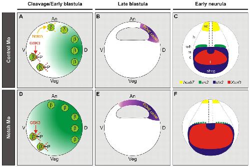 Fig. 10. Model for Notch function during early development of Xenopus. (A-C) Normal development of a Xenopus embryo injected with control Mo, showing β-catenin dynamics at cleavage or early blastula stages (A), the blastula chordin- and noggin-expressing centre (BCNE) at late blastula (B) and the anterior-posterior (A-P) pattern of the neural plate at early neurula (C). During cleavage stages or early blastula, β-catenin is normally degraded at the ventral side but accumulates in the nuclei of the dorsal side, forming a dorsal-to-ventral gradient, as illustrated in green (A). For simplicity, only the GSK3 and Notch pathways are shown (in red and orange, respectively). GSK3 phosphorylates serine residues 33 and 37 of β-catenin. Phosphorylated β-catenin (β-P) is targeted for fast degradation by the ubiquitin-proteasome system (red dotted lines). Notch targets hypophosphorylated β-catenin (β) for degradation, probably by the endocytic-lysosomal pathway (orange dotted lines). Nuclear β-catenin activity in the dorsal animal/marginal cells of the blastula promotes the formation of the BCNE (purple area in B). The whole forebrain and most of the midbrain and the hindbrain derive from the BCNE (C). (D-F) Changes observed in β-catenin dynamics at cleavage or early blastula stages (D), in the extent of the BCNE at late blastula (E) and in the A-P pattern of the neural plate at early neurula (F) when Notch is attenuated by injection of Notch Mo prior to the first cleavage. When Notch is attenuated, hypophosphorylated β-catenin is further stabilised in more ventral locations (D). This results in a ventral expansion of the BCNE at late blastula (E) and BCNE derivatives are enlarged in the early neurula (F). C and F are diagrams of embryos in anterior-dorsal views, summarising the results shown in Fig. 8A-F. An, animal; Veg, vegetal; D, dorsal; V, ventral; shcg, stomodeal-hypophyseal and cement gland anlage; t, presumptive telencephalon; d, presumptive diencephalon; m, presumptive mesencephalon; m/h, presumptive boundary between midbrain and hindbrain; h, presumptive hindbrain; sc, presumptive spinal cord. |