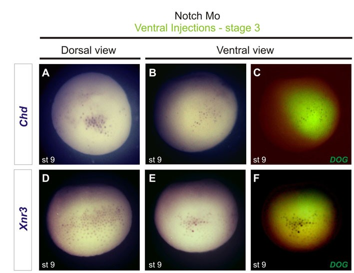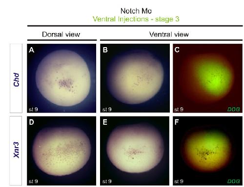 Fig. S1. Attenuation of Notch from stage 3 induces weak ectopic expression of blastula chordin- and noggin-expressing centre (BCNE) markers at the ventral side. (A-F) Xenopus embryos were injected with 20 ng of Notch morpholino (Mo) into one ventral cell at stage 3. Expression of chd (A-C) and Xnr3 (D-F) at stage 9 is shown in dorsal (A,D) and ventral (B,E) view. B and E are ventral views of the embryos shown in A and D, respectively, with ectopic chd (B) or Xnr3 (E) expression. These embryos represent the strongest phenotypes. Green fluorescence of the co-injected Dextran Oregon Green tracer (DOG; C,F) correspond to the same views shown in B and E. |