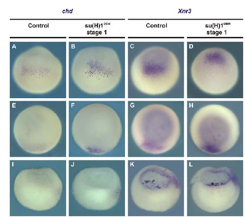 Fig. S2. Attenuation of CSL-mediated Notch signalling does not result in an expansion of BCNE markers on the animal hemisphere. (A-L) Expression of chd (A,B,E,F,I,J) and Xnr3 (C,D,G,H,K,L) at stage 9 in Xenopus embryos injected with 2 ng of su(H)1DBM mRNA prior to the first cleavage (B,F,J,D,H,L) or uninjected sibling controls (A,E,I,C,G,K). A-D are dorsal views. E-H are animal views of the embryos shown in A-D, respectively. I-L are hemisections of the embryos shown in A-D, respectively. The dorsal side is to the right, animal up. |