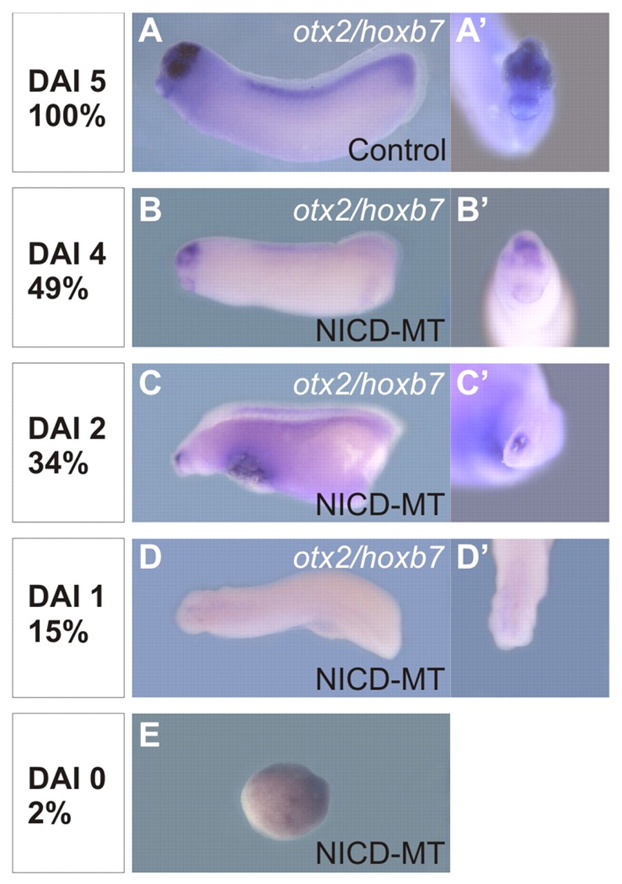Fig. 3. Notch gain of function produces ventralised phenotypes. Xenopus embryos were injected with 1 ng of nicd-mt RNA before the first mitotic division and were allowed to develop until stage 28, when they were scored according to the dorsoanterior index (DAI) (Kao and Elinson, 1988). DAI 5, normal; DAI 4, reduced eyes and forehead; DAI 2, microcephalic; DAI 1, acephalic; DAI 0, bauchstück. The percentage corresponding to each phenotype is shown at the left (n=47). (A,Aâ²) Lateral (A) and frontal (Aâ²) views of a sibling control embryo hybridised with the cephalic marker otx2 (Pannese et al., 1995; Blitz and Cho, 1995) and the posterior marker hoxb7 (López and Carrasco, 1992; Godsave et al., 1994). (B-Dâ²) Lateral (B-D) and frontal (Bâ²-Dâ²) views of embryos injected with nicd-mt RNA and hybridised with otx2 and hoxb7. Note the loss of cephalic structures at different grades, as revealed by otx2 expression. (E) An extremely ventralised embryo injected with nicd-mt mRNA. |