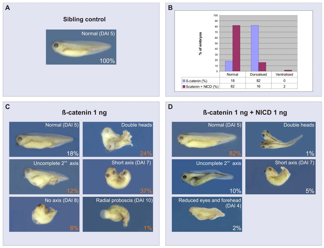 Fig. 4. Notch abolishes the dorsalising activity of β-catenin. (A,C,D) External phenotypes of Xenopus tadpoles at stage 35. A shows a control tadpole. Sibling embryos were injected into one ventral blastomere at the 4-cell stage with 1 ng of β-catenin-GFP mRNA (C) or with 1 ng of β-catenin-GFP mRNA + 1 ng of nicd-mt mRNA (D) and fixed at the tadpole stage (stage 35). Embryos were scored according to the dorsoanterior index (DAI) (Kao and Elinson, 1988). Dorsalised phenotypes also include double heads and incomplete secondary axis. Most embryos injected with β-catenin-GFP mRNA were dorsalised (82%, n=74; the percentage of each dorsalised phenotype is shown in orange; C). Most embryos injected with 1 ng of β-catenin-GFP mRNA + 1 ng of nicd-mt mRNA were indistinguishable from sibling controls (82%, n=92; percentage in orange in D). (B) Frequency distribution of normal, dorsalised or ventralised phenotypes, expressed as percentage of injected embryos for β-catenin-GFP mRNA alone (blue bars, n=74) or β-catenin-GFP mRNA + 1 ng of nicd-mt mRNA (red bars, n=92), as described for C and D. |