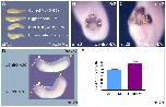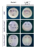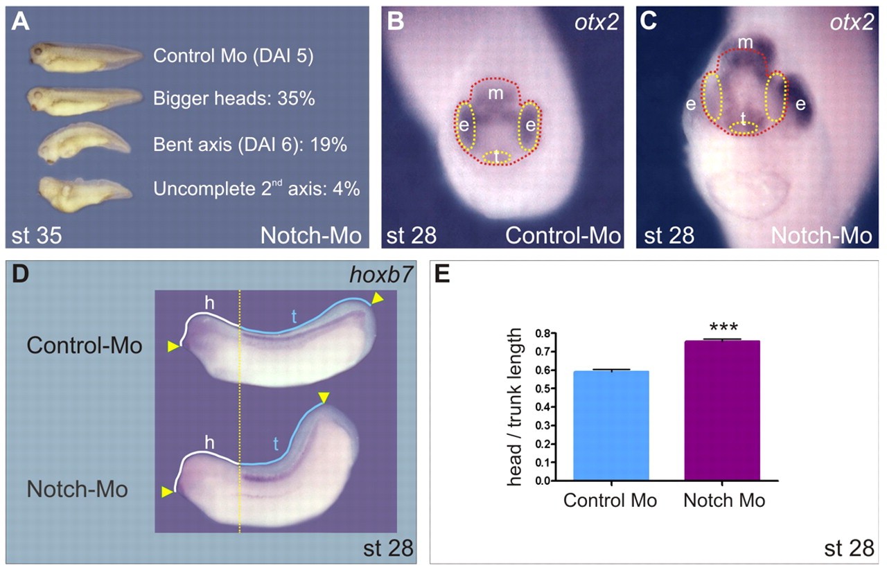 Fig. 9. Attenuation of Notch from the 1-cell stage onwards enhances dorso-anterior development. Sibling Xenopus embryos were injected prior to the first cleavage with 20 ng of control morpholino (Mo) or 20 ng of Notch Mo. (A) External morphology of stage 35 tadpoles injected with control Mo (upper embryo) or Notch Mo. Three examples of enhanced dorso-anterior development produced by Notch Mo are shown below the control Mo-injected tadpole. (B,C) Expression pattern of otx2 at stage 28 in a control Mo-injected tailbud (B) and a Notch Mo-injected sibling (C), shown in frontal views. The dotted red line in B depicts the contour of cephalic structures marked by otx2 in a control Mo-injected embryo, including the prospective telencephalic domain (t, encircled by a yellow dotted line), the prospective eye domains (e, encircled by yellow dotted lines) and the prospective mesencephalic domain (m). These domains were projected on the Notch Mo-injected sibling shown in C, taking the telencephalic otx2 domain as reference, to emphasise the expansion of the most cephalic structures. (D) Lateral view of a control Mo-injected tailbud (upper embryo) and a Notch Mo-injected sibling (lower embryo) at stage 28, showing the expression of hoxb7, aligned with respect to the anterior limit of hoxb7 (vertical yellow line). The left arrowheads point to the cement gland, and the right arrowheads to the tip of the tail. Head length (h, white line) was measured from the cement gland to the hoxb7 anterior limit. Trunk length (t, blue line) was measured from the hoxb7 anterior limit to the tip of the tail. (E) Notch Mo-injected tailbuds (red bar) display a significantly higher head/trunk length ratio than control Mo-injected siblings (blue bar). P<0.0001, two-tailed t-test. |