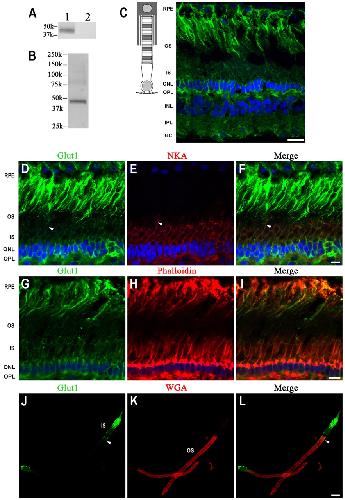 Fig.2. Glut1 immunolocalization in amphibian retina. (A) Western blot analysis of retinal extracts from mouse (lane 1) and Xenopus (lane 2), probed with anti-human Glut1 polyclonal antibody. The Xenopus isoform was not recognized. (B) The polyclonal antibody raised against Xenopus Glut1 specifically recognized this protein in an immunoblot of Xenopus retinal extract. (C) A section of Xenopus retina immunostained for Glut1 (green). Nuclei were counter-stained with Hoechst 33342 (blue). To the left is a schematic of a frog rod photoreceptor with an overlying RPE cell, illustrating the relative positions of individual subcellular compartments. Abbreviations are the same as in Fig. 1. Scale bar: 20 μm. (DâI) Xenopus retinal cryosections stained for Glut1 (green) and Na+/K+-ATPase (NKA, red; DâF) or phalloidin (red; GâI). Glut1 localized to the RPE and its microvilli, and to the rod photoreceptor plasma membrane in the synaptic, nuclear and inner segment layers. Labeling of the Na+/K+-ATPase (DâF) was used as a marker for the photoreceptor inner segment plasma membrane and calycal processes (arrowheads). Labeling of F-actin with phalloidin (GâI) was used as a marker for the RPE microvilli, in addition to the photoreceptor calycal processes. (JâL) Staining of two isolated rod photoreceptor fragments revealed Glut1 (green) on inner segment (IS) membranes and calycal processes (arrowheads) but not along the plasma membrane of outer segments (OS) marked by wheat germ agglutinin (WGA, red). Scale bars: 10 μm (DâL).