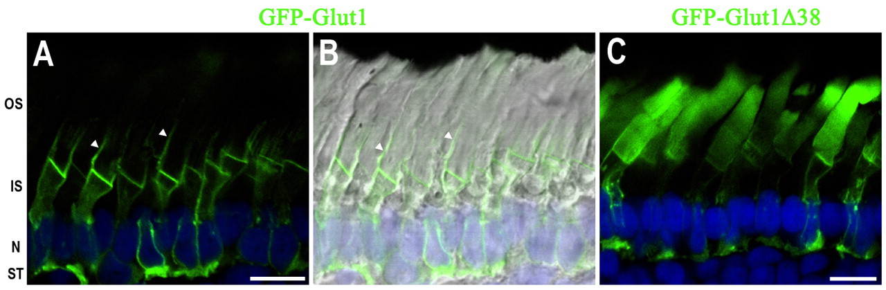 Fig.4. GFP-tagged Glut1 is actively excluded from rod outer segments of transgenic Xenopus tadpoles. (A,B) GFP-tagged Glut1 was expressed in transgenic tadpole rods and localized to the plasma membrane of the synaptic terminal, nuclear region and inner segment, including the calycal processes (arrowheads). The outer segments extend well beyond the GFP signal in the calycal processes (B). (C) GFP-tagged Glut1 mutant lacking its 38-residue C-terminal tail (GFPâGlut1δ38) displayed prominent outer segment localization in tadpole rods. OS, outer segment; IS, inner segment; N, nucleus; ST, synaptic terminal. Scale bars: 10 μm.