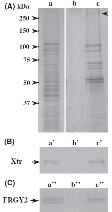 respectively. (B) Western blot analysis of gel-filtrated fractions using anti-Xtr (upper panel) and anti-FRGY2 (lower panel) rabbit antisera.