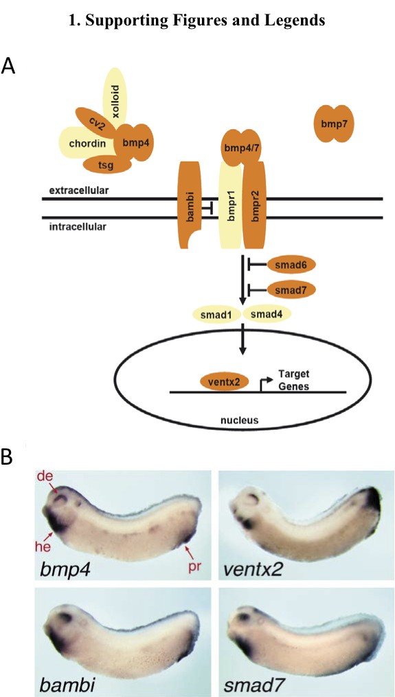 Fig. S1. The Xenopus laevis BMP4 synexpression group. (A) Schematic model of the Xenopus laevis BMP4 synexpression group embedded into the BMP4/7 signal transduction pathway. Members of the BMP4 synexpression group are drawn in red while non- synexpressed pathway components are in yellow. (B) In situ hybridization of bmp4 and synexpression group members ventx2, bambi, and smad7 in tailbud stage X. laevis embryos; dorsal eye (de), heart field (he), proctodeum (pr). The figure is partially reproduced and adapted from (1) with permission of EMBO Journal.