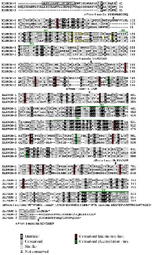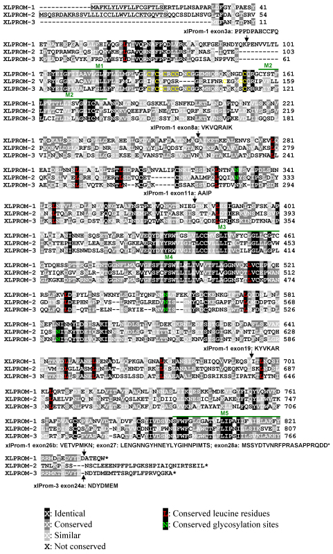 Figure 1. Alignment of the predicted protein sequences of three X. laevis prominin homologs, showing characteristic features of prominins, including the pentaspan transmembrane topology, a conserved cysteine rich domain, conserved leucine residues and N-glycosylation sites. We designated the three X. laevis prominin homologs as xlProminin-1, 2, and 3, respectively. Identical and conserved residues are indicated by differentially shaded boxes. Predicted transmembrane domains are marked with M#. The predicted signal peptides of xlProminin-1 and 2 are boxed. No signal peptide was predicted for xlProminin-3. Positions of alternatively spliced exons are indicated by arrows and the sequences of the alternatively spliced exons are given. Note that the N- and C-termini of the three X. laevis prominin homologs are less similar than other regions. Cysteine residues at the junction of M1 and the first intracellular domain (I1) are marked with yellow. Conserved leucine residues of the three xlProminin homologs are marked with red. Conserved glycosylation sites are marked with green. |