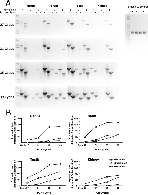 Figure 3. Semiquantitative reverse-transcription PCR analysis of xlProminin-1, 2, and 3 performed on the retina, brain, testis, and kidney. A: Aliquots (20 μl) of the PCR reaction were taken at the end of the 27th, 31st, 35th, and 39th cycles, separated and visualized on a 1% agarose gel. Two independent primer pairs (see Table 2) were used to amplify each xlProminin homolog in each tissue to ensure the specificity and efficiency of the PCR reaction. A fragment of Xenopus laevis β-actin cDNA was also amplified from equivalent starting material of total RNA to serve as a control. The Invitrogen 1KB PLUS DNA (Cat. No. 10787â018) ladder was used for size standards. B: Integrated signals in areas occupied by individual DNA bands were quantified and plotted to compare the relative expression level of xlProminin-1, 2, and 3 in four X. laevis tissues: the retina, brain, testis, and kidney. xlProminin-1, 2 and 3 are expressed in all four tissues. Among the three prominin homologs, prominin-1 is predominantly expressed in the retina, brain, and testis, while prominin-3 is predominantly expressed in the kidney. The expression level of prominin-2 is the lowest of the three prominin homologs in all examined tissues, and is barely detectable in the kidney. |