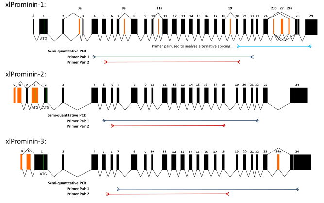 Figure 4. Exon organization of xlProminin-1, 2, and 3. Homologous exons of xlProminin-1, 2, and 3 are aligned. Genes of all three xlProminins are alternatively spliced and their exon organization is evolutionarily conserved. Constitutive exons are marked in black. Alternatively spliced exons are marked orange. Spliced forms identified in cDNA clones are indicated by joining lines. Translation start sites (ATG) are marked with green lines and the positions of translational stop codons are marked with white lines. Note the complex splicing of exons 26b, 27, and 28a, which generates several distinct isoforms of xlProminin-1. Positions of primers used in reverse-transcription (RT)-PCR for semiquantitative analysis of mRNA expression and for alternative splicing are indicated on the diagram. |