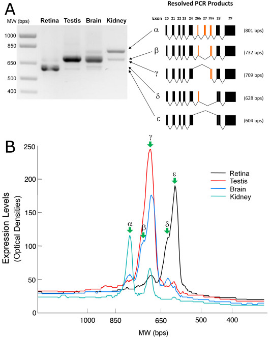 Figure 5. Analysis of the xlProminin-1 alternatively spliced isoforms in four tissues: the retina, brain, testis, and kidney. We found that profiles of the xlProminin-1 alternative splicing are different in these tissues. A: Products of reverse-transcription PCR (RT–PCR) from a region of extensive alternative splicing on the xlProminin-1 gene (exon 20 to 28) were separated on a 1% agarose gel and visualized with ethidium bromide staining. Five discrete PCR products were excised from the gel, cloned, and sequenced. Their exon compositions were determined and each product was designated with a Greek letter (α, β, γ, δ, and ε) for identification when used in the quantitative analysis shown in panel B. The predominant isoforms of xlProminin-1 expressed in the retina lack the alternatively spliced exons 26b, 27, and 28a, whereas the predominant isoform of xlProminin-1 expressed in the kidney retains these exons. The predominant isoforms of xlProminin-1 expressed in the brain and kidney retain exon 28a. Exon 27 was retained only when exon 26b was retained as well. B: Quantification of the xlProminin-1 alternatively spliced isoforms in four tissues: the retina, brain, testis, and kidney. The resolved RT–PCR products were linearly scanned and the optical densities were plotted. Green arrows indicate peaks that represent isoforms resulting from alternative splicing. The major isoform of xlProminin-1 expressed in the retina, ε, lacks the alternatively spliced exons 26b, 27, and 28a, whereas the major form of xlProminin-1 expressed in the kidney, α, retains all possible exons. The majority of xlProminin-1 expressed in the brain and kidney retains exon 28a. |